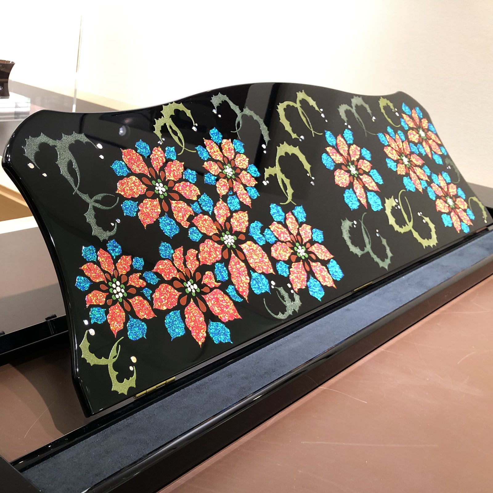 【制作】お宅のグランドピアノ譜面台をお預かりして漆工芸作家により彩輝光蒔絵を施します。完全受注生産となります。下絵(モノクロ)を用意しますので予めご覧のうえデザインについてご了承いただいてから制作に入ります。制作期間は4ヶ月以上(制作範囲によります)。