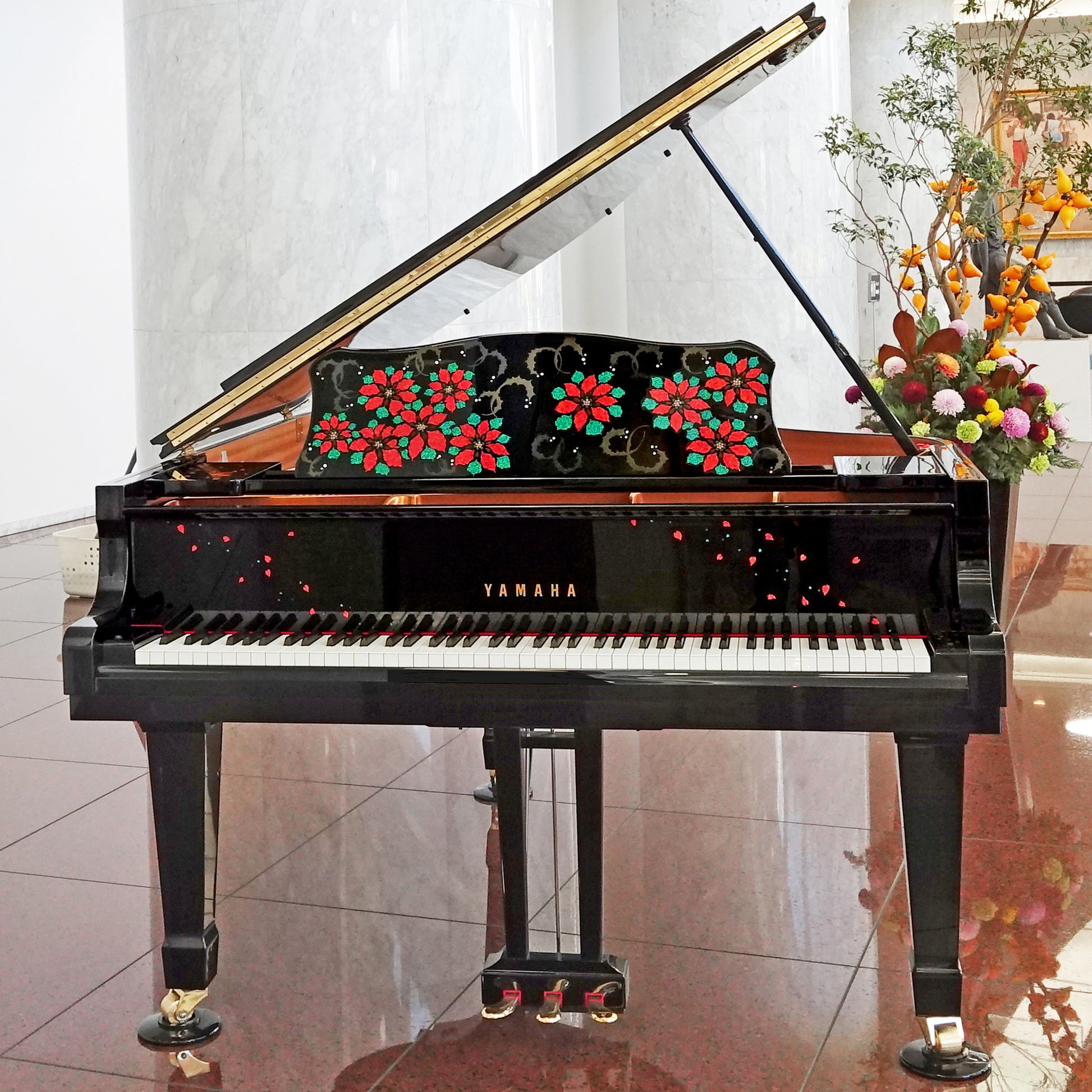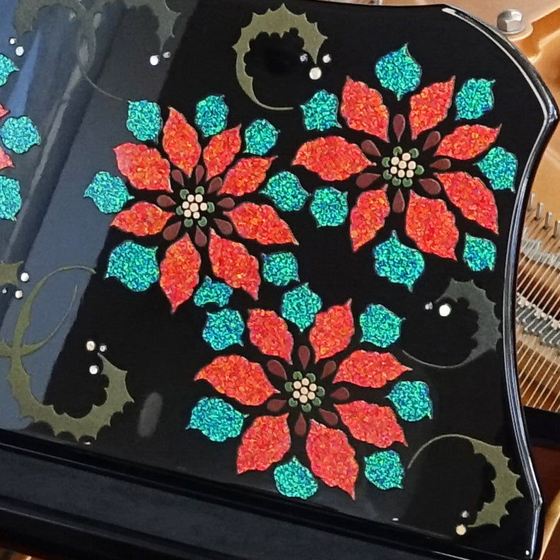 【特長】彩輝光蒔絵「冬の笑美」~クリスマスをイメージしたモデルです。伝統的技法の蒔絵で柊の葉を、京都オパールを使用した新工芸の彩輝光によりポインセチアを表現しています。完全手作業の制作です。完全手作業の制作です。演奏の歓びだけでなく、視覚的な美しさも堪能できるこのピアノは、音楽と工芸の融合を極めた至高の逸品。所有する喜び、演奏する歓び、鑑賞する愉しみのすべてを叶えるアートピースともいえる一台です。